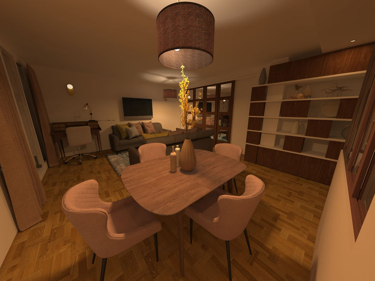 La conception d'un projet de salon et salle à manger pour un couple qui voulait faire un endroit confortable pour passer du temps à la table à manger avec une belle vue le matin et le déjeuner, et le soir se détendre sur le canapé regarder la télévision, profiter du coucher du soleil, car il est le côté ensoleillé. La difficulté du projet était de placer et de séparer correctement ces deux zones et de répondre aux désirs du client.